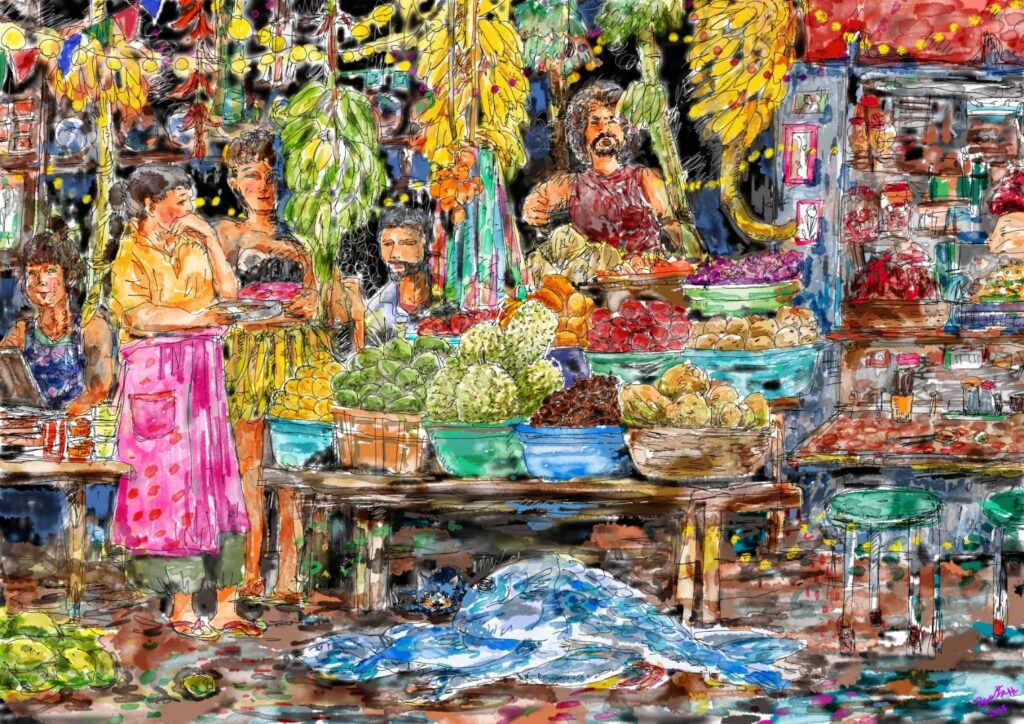 『じゃあ、私それを絵にする!夏のアジアの市場のムワッとした怪しげな絵、描きたい!!イベントの日も怪しい飾りとか作って盛り上げる!』